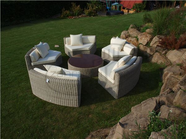 Sestava zahradního nábytku z umělého ratanu a hliníkové konstrukce, lze seskládat podle vašich potřeb. Sestava se skládá ze stolku o průměru 110cm a různého počtu modulů. Uvedená cena je za sestavu 4x modul a stolek.
